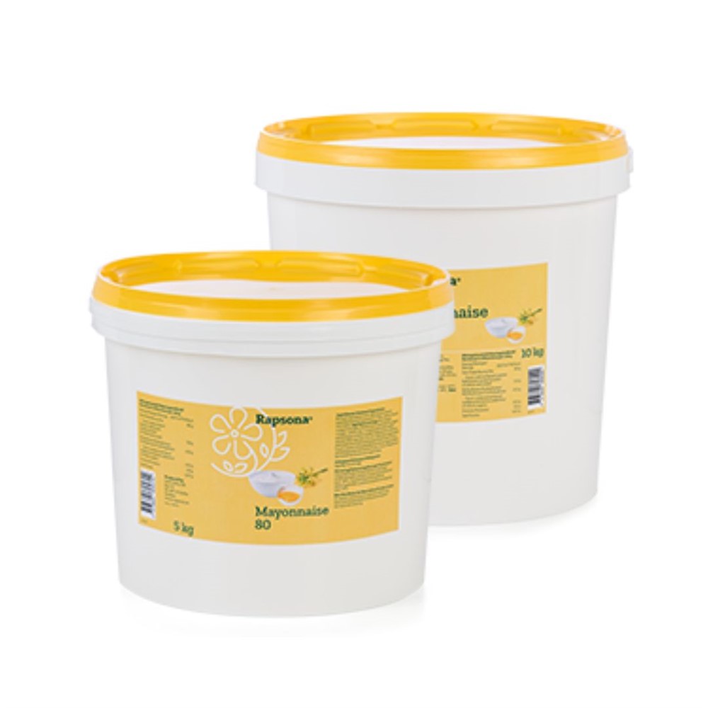 Majonnäs 80% 10 kg. Ingredienser: Rapsolja, vatten, ägg, dragonvinäger, salt, surhetsreglerande medel (E 270), stabiliseringsmedel (E 415, E 412), konserveringsmedel (E 202, E 211), färgämne (E 160a).