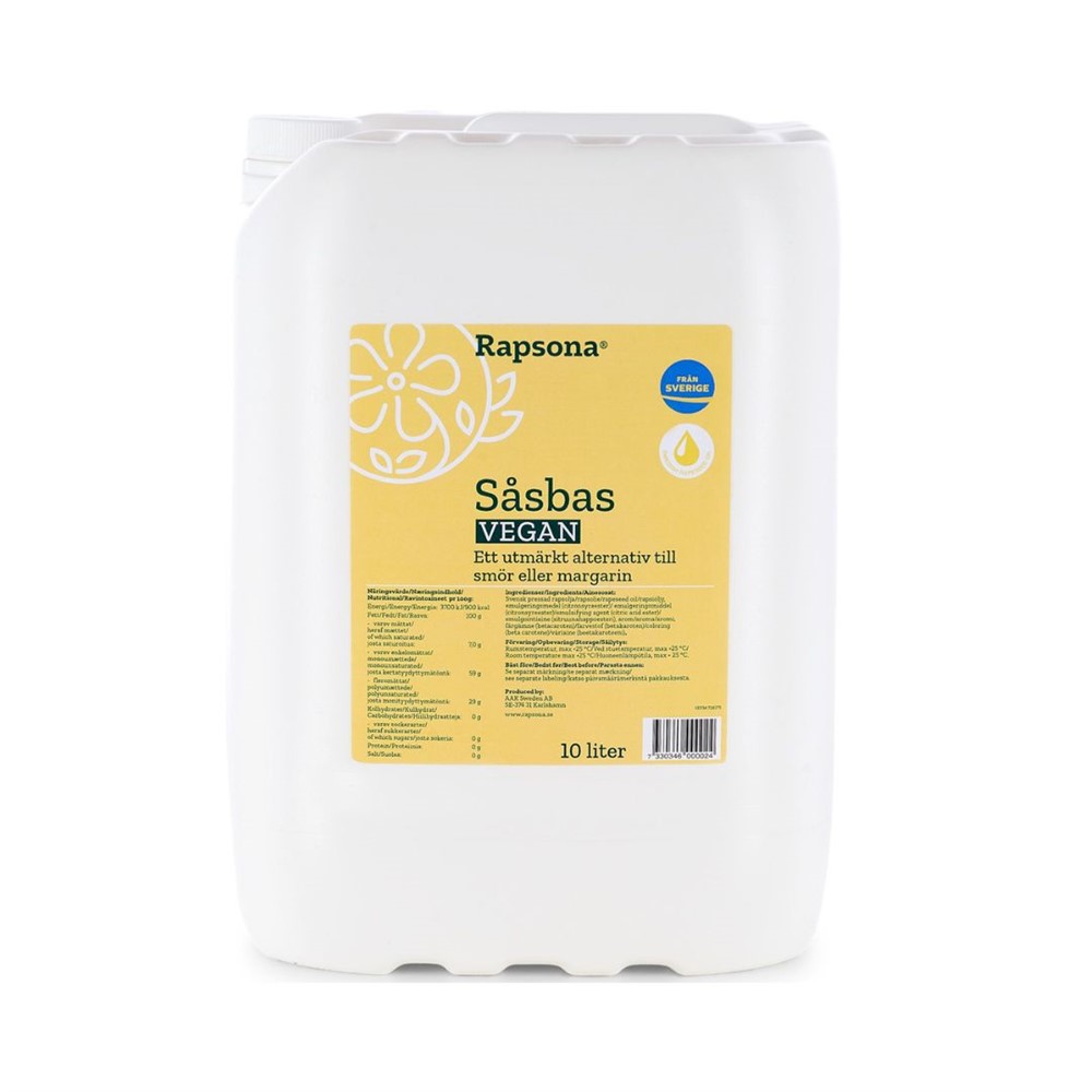 Såsbas Rapsona 10 liter. Ingredienser: Svensk pressad rapsolja/rapsolie/rapeseed oil/rapsiöljy, emulgeringsmedel (citronsyraester)/emulgeringsmiddel (citronsyreester)/emulsifying agent (citric acid ester)/emulgointiaine (sitruunahappoesteri), arom/aroma/aromi, färgämne (betacaroten)/farvestof (betakaroten)/coloring (beta carotene)/väriaine (beetakaroteeni). Tillverkningsland Sverige.